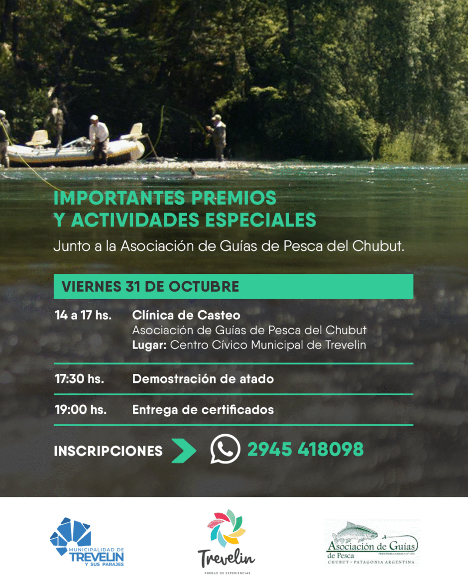 Organizado por la Secretaria de Turismo de Trevelin, la asociación de Guías de Pesca del Chubut y Pesca Continental brindarán curso de casteo y demostración de atado de moscas de cara al inicio de la temporada de Pesca deportiva 2025/2026, con entrega de certificados.