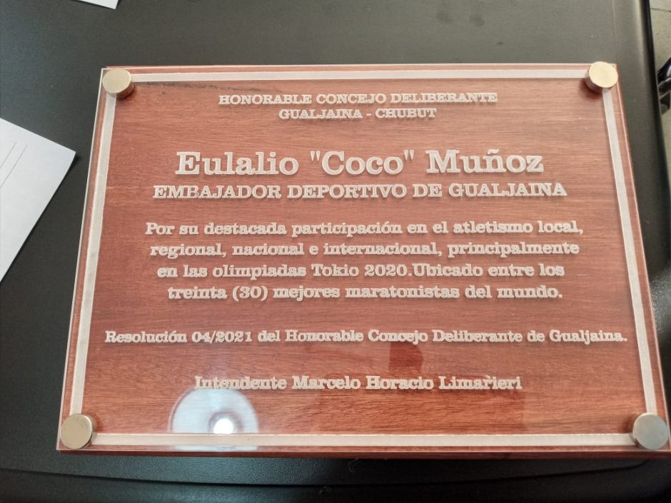 Eulalio “Coco” Muñoz fue nombrado embajador deportivo de Gualjaina por el Honorable Concejo Deliberante de esa localidad. Al finalizar el acto protocolar el atleta olímpico dijo “con esfuerzo y disciplina todo se logra”.