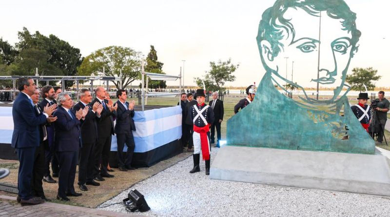 Durante el acto, se descubrió una escultura en honor a Belgrano realizada por trabajadores y trabajadoras del astillero Tandanor, quienes entregaron también una réplica al Presidente.