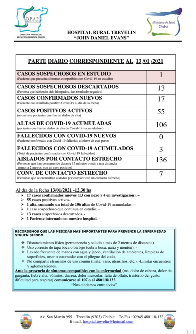 Diecisiete casos positivos de covid-19 reporto la ciudad de Trevelin en el parte emitido hoy por el Hospital local.