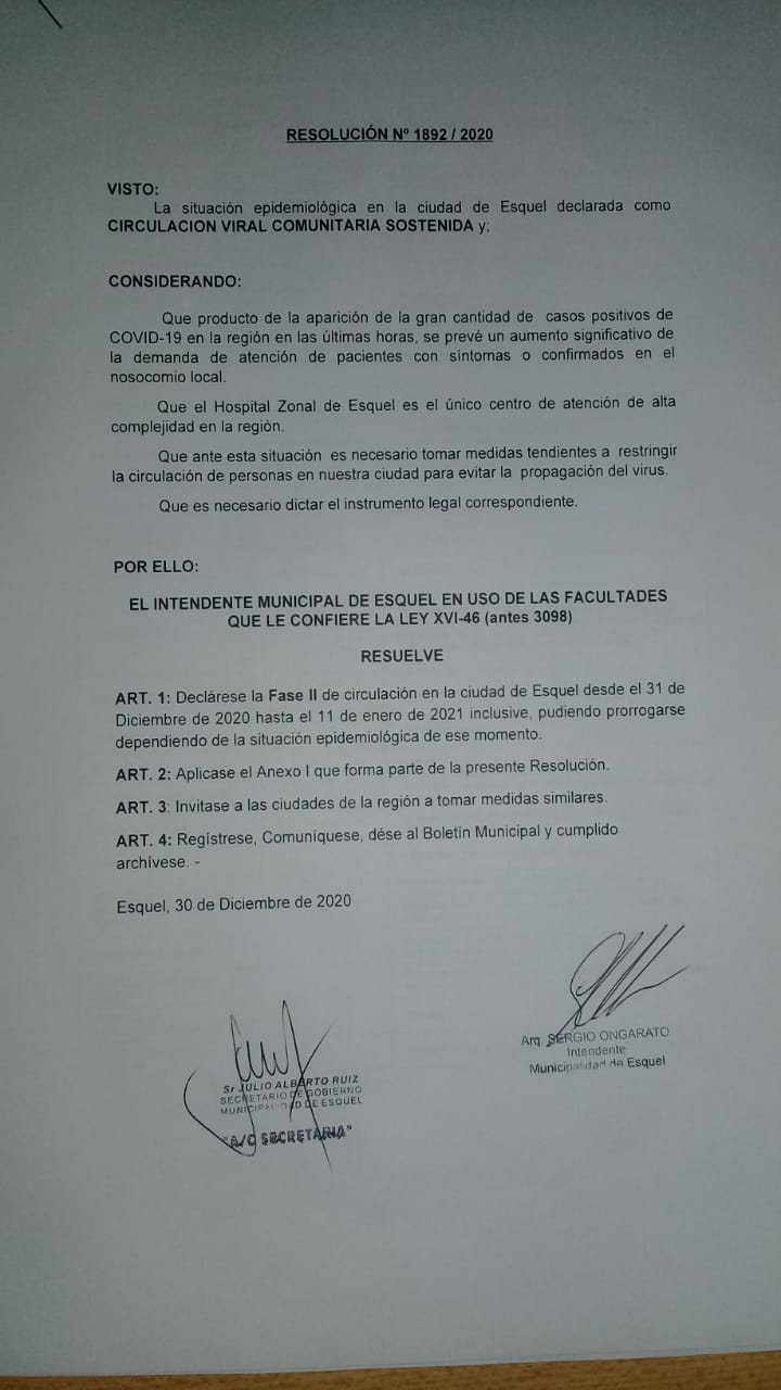 Mediante resolución municipal el intendente de la ciudad de Esquel, Sergio Ongarato decidió volver a fase 2 hasta el once de enero. Lo anunció hoy en conferencia de prensa.