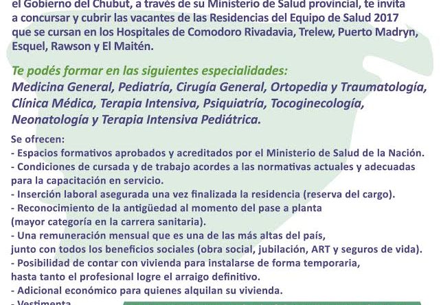 El Ministerio de Salud provincial, que conduce Ignacio Hernández, continúa realizando una campaña de comunicación por distintos medios dirigida a estudiantes de Medicina que estén por recibirse y a médicos que se hayan graduado en los últimos 5 años, en cualquier parte del país, con el propósito de que se inscriban para concursar y cubrir las vacantes de las Residencias del Equipo de Salud de Chubut 2017.
