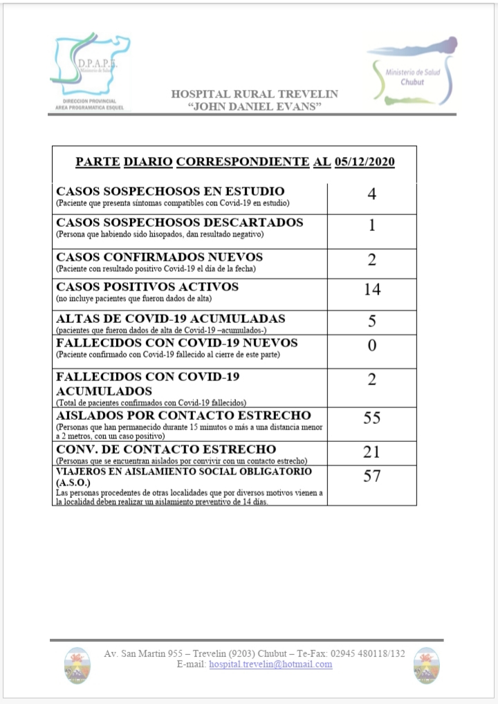 El hospital de Trevelin informó 2 nuevos casos positivos de covid-19 este sábado. 4 casos sospechosos en estudio, 1 caso sospechosos descartado.
