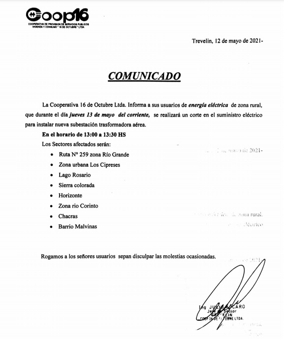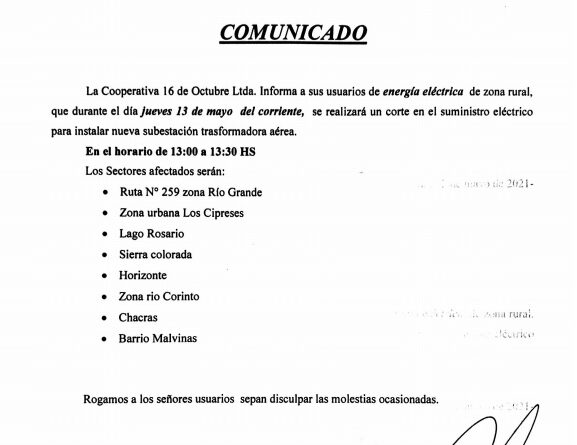 La Cooperativa 16 de Octubre informó que realizará corte de energía eléctrica aquí la zona afectada.